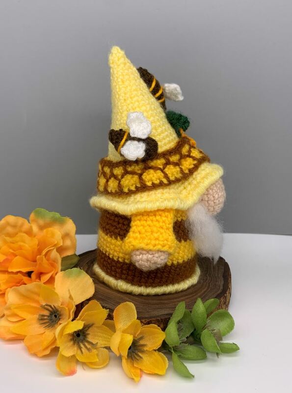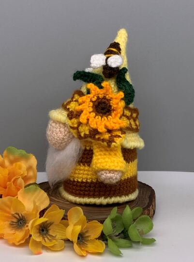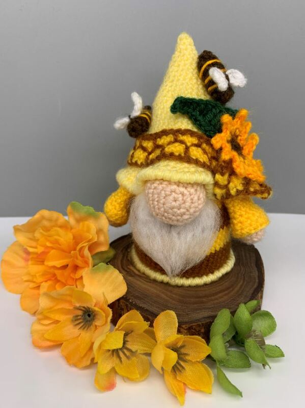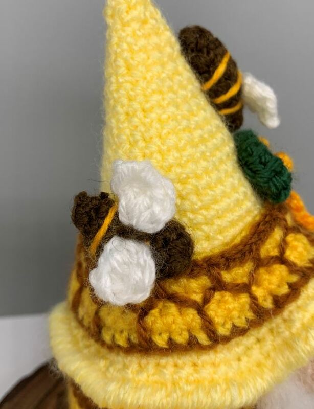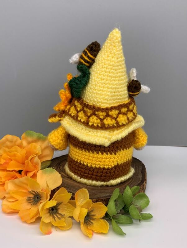 With this pattern you can crochet an adorable bee gnome, with a honeycomb hat band, sweet bees and a cute little sunflower on the hat.