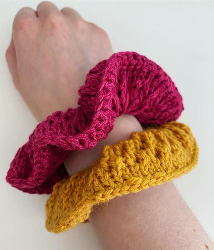 The scrunchie is knitted in rounds with an easy lace pattern. After that the hairband is enclosed with the knitted piece and the edges are closed with single crochet stitch.