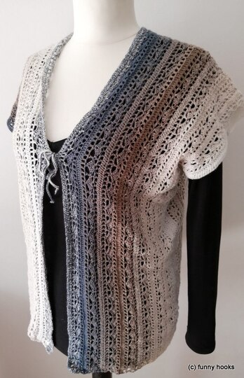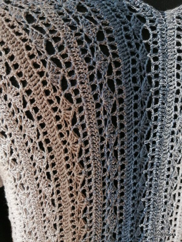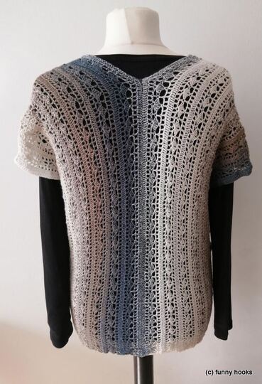The shirt or jacket on the cover picture is size 40/42. For this I used 1250 m of a 3 ply, cotton/polyacryl yarn cake, with a hook size 3,00mm
