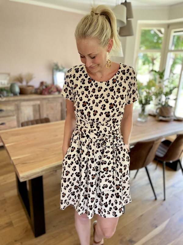 optionalen Bindegürtel sitzt das Kleid figurnah. Die ebenfalls optionalen Taschen bieten Platz für Handy oder Kleingeld.