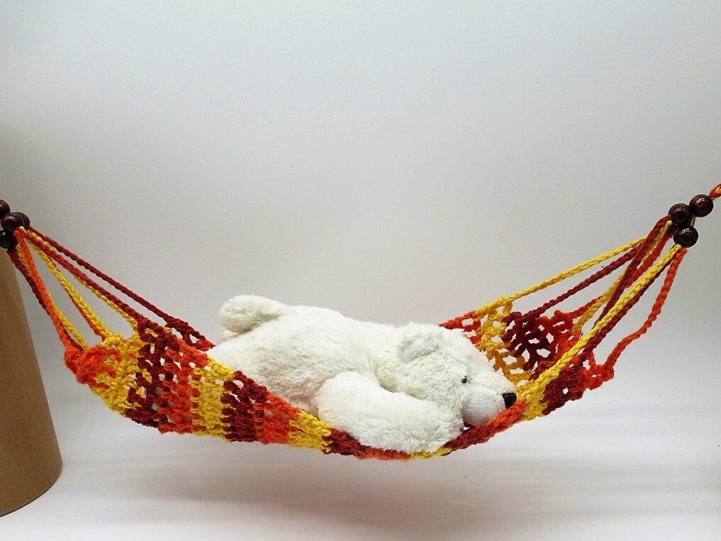 In dieser bunten Hängematte können kleine Puppen so richtig relaxen! Dieses Projekt lässt sich super mit wenigen Wollresten verwirklichen und ist ein tolles Accessoire im Puppenhaus. Sie bietet auch Platz für kleine Stofftiere.