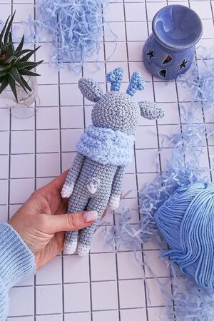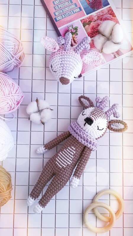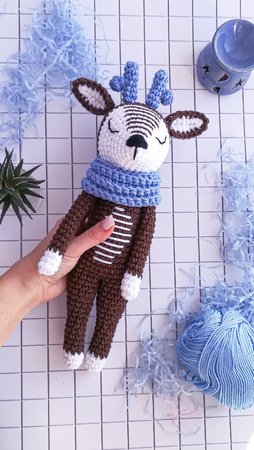 Deer is about 21 cm, If you use cotton yarn (50g/160m) and about 30 cm, if you use thicker yarn (100g/160m). The final size of the toy depends on the thickness of the yarn, the number of the hook and the density of knitting, so it may slightly differ from what I indicated in the pattern.