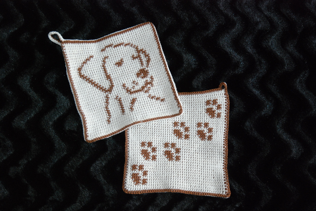 Potholder for dog lovers: The motifs of these potholders are a dog's head (Labrador/Retriever) and a paw track.