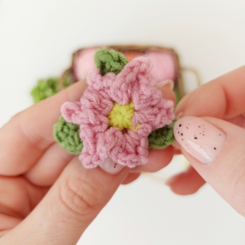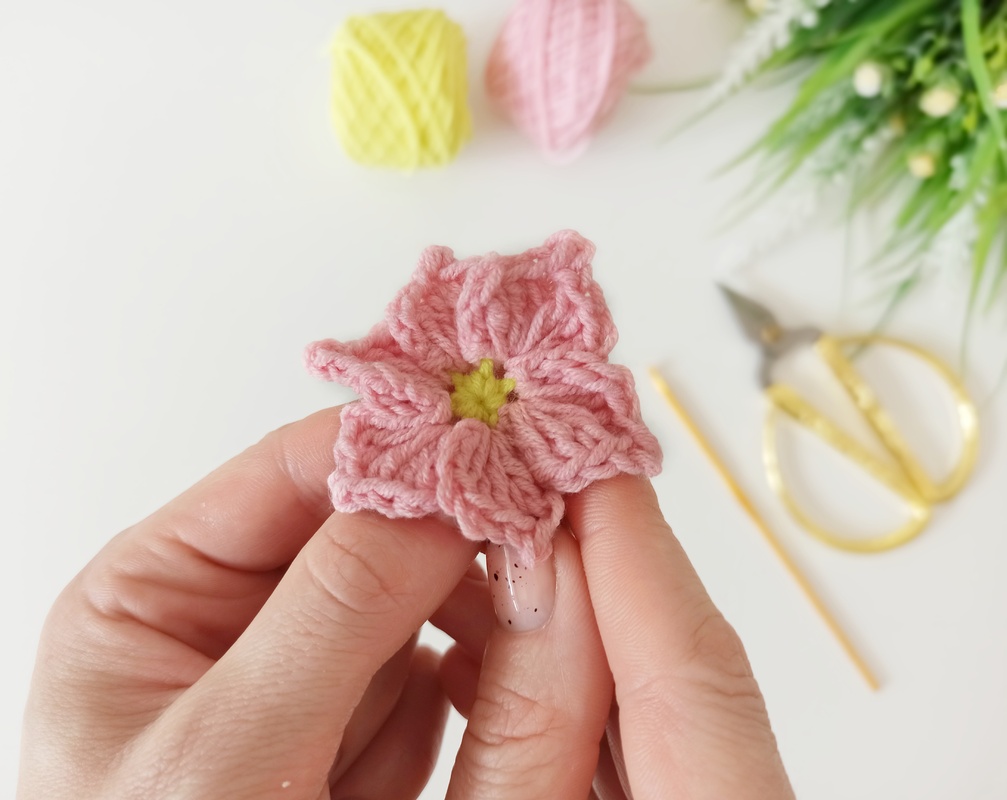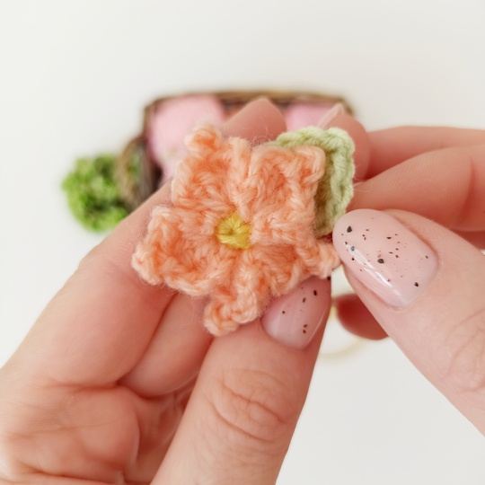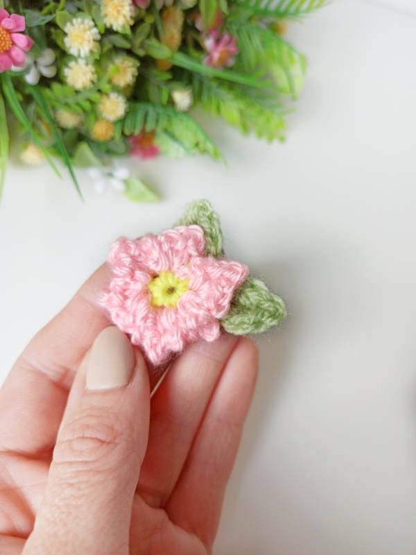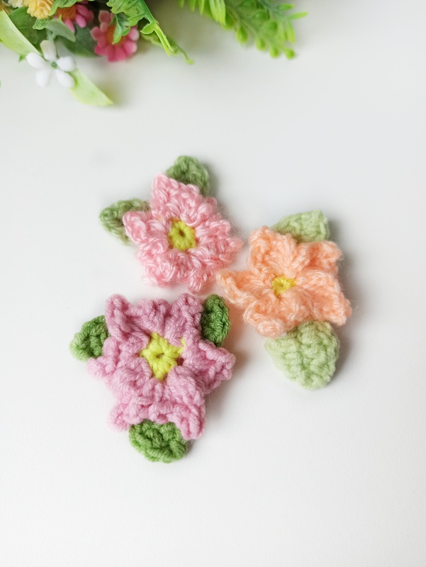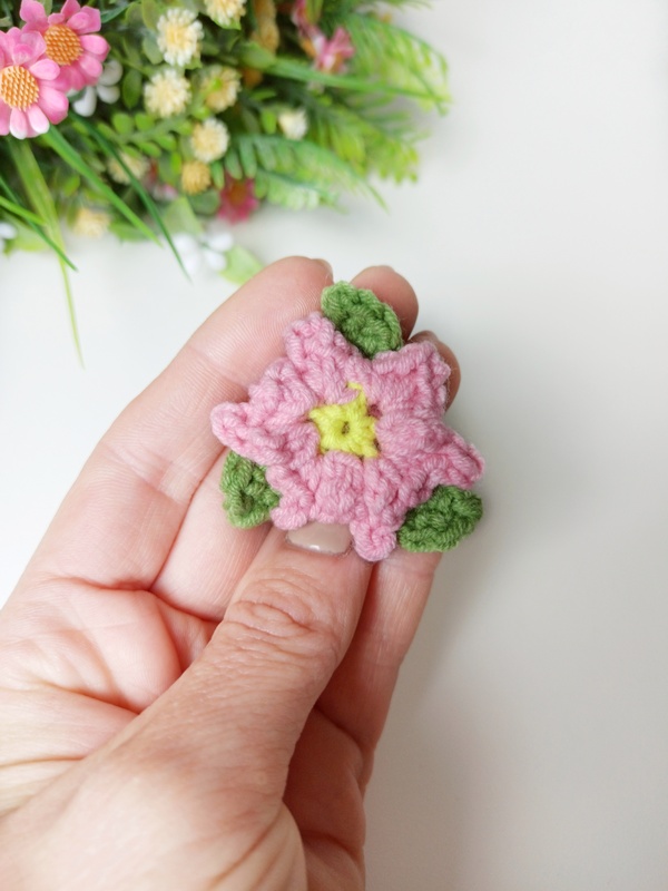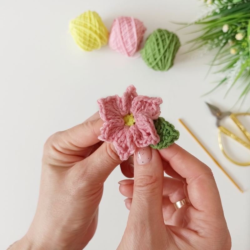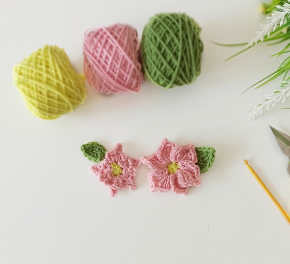 My flowers measure 3 cm across with the yarn Yarn Art Jeans and a 3 mm crochet hook. You can use any material you like to make these flowers and leaves.