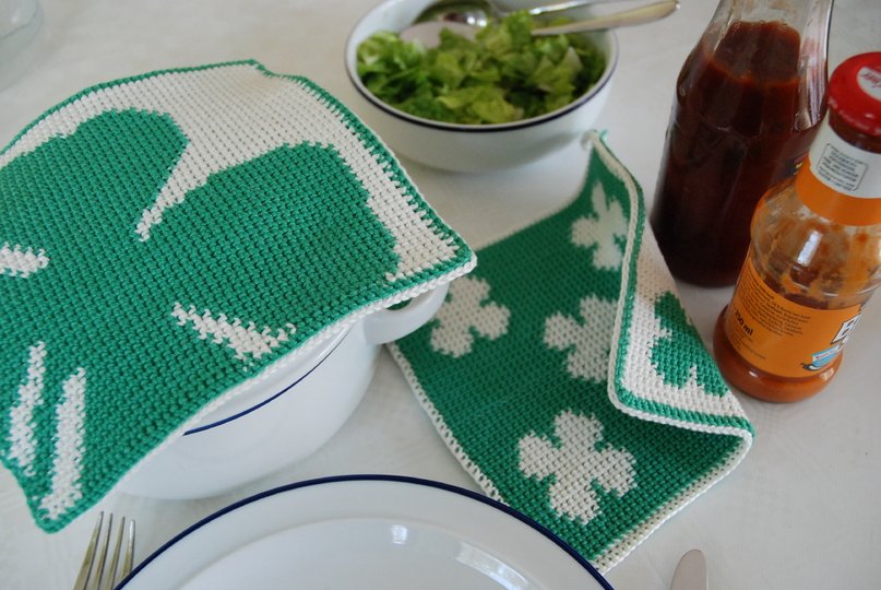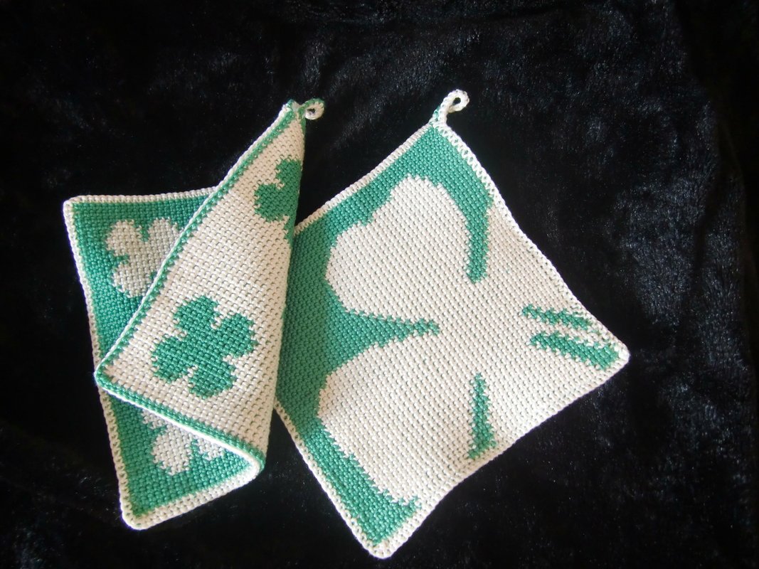 You can never have enough happiness! As a gift, this double-faced potholder is a different kind of congratulations. The motifs on this potholder are several small shamrocks and one large (not quite visible) shamrock. They can be combined in any way you like.
