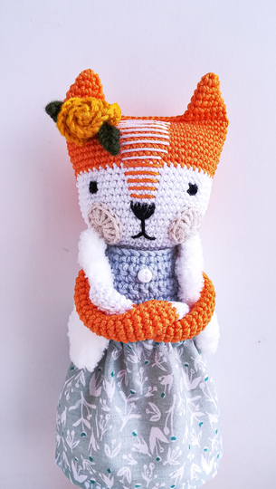 Fox is about 26 cm, If you use cotton yarn (160m/50g). The size of the toy depends on the thickness of the yarn, the number of the hook and the density of knitting, so it may slightly differ from what I wrote in the pattern.