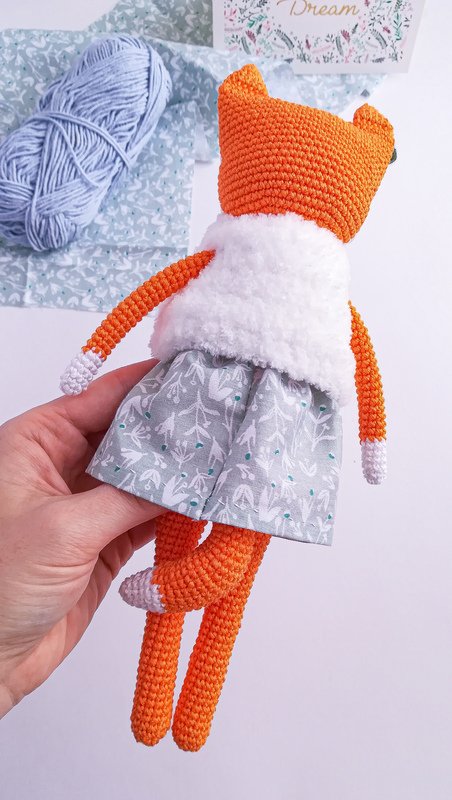 There is detailed photo instruction on how to sew a dress or skirt for a fox without using a sewing machine in the pattern. Due to the lesson, you can do it easy in 30-40 minutes.