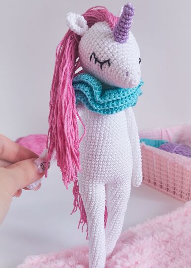 Unicorn is about 24 cm, If you use cotton yarn (100g/270m) and hook №2. The final size of the toy depends on the yarn thickness, the hook size and the density of crocheting, so it may slightly differ from what I indicated in the pattern.