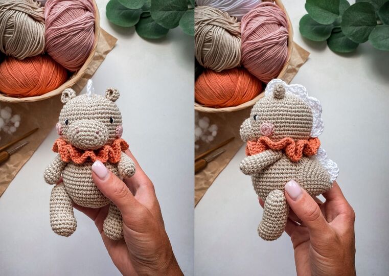 Dino is about 5.5 inches If you use Alize Cotton Gold or Yarn Art Baby Cotton (50g/165m) or similar yarn and hook №2. The final size of the dino depends on the yarn thickness, the hook size and the density of crocheting, so it may slightly differ from what I wrote in the pattern.