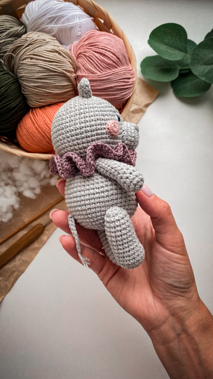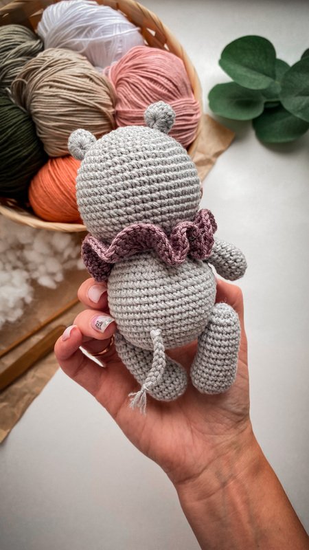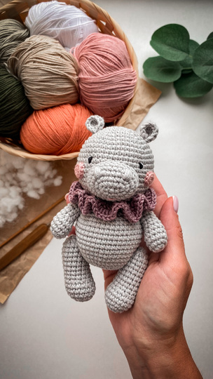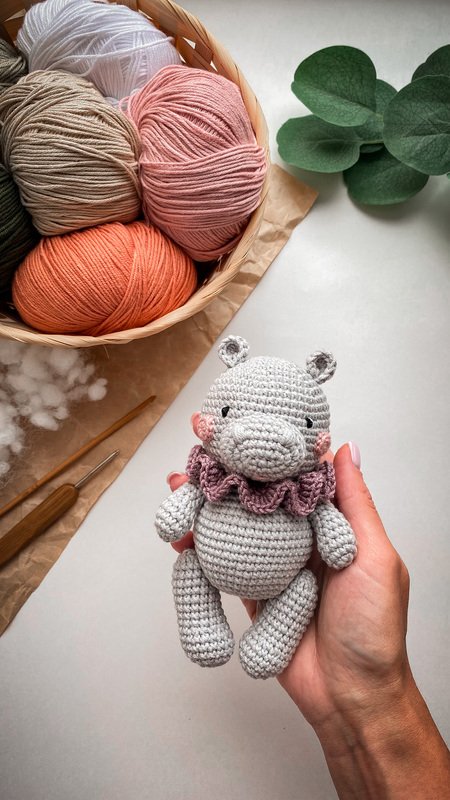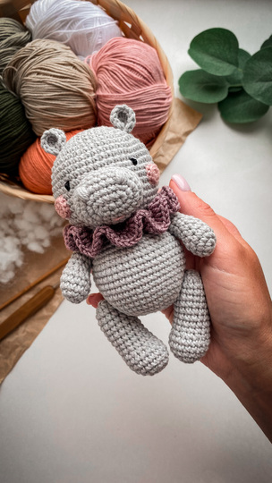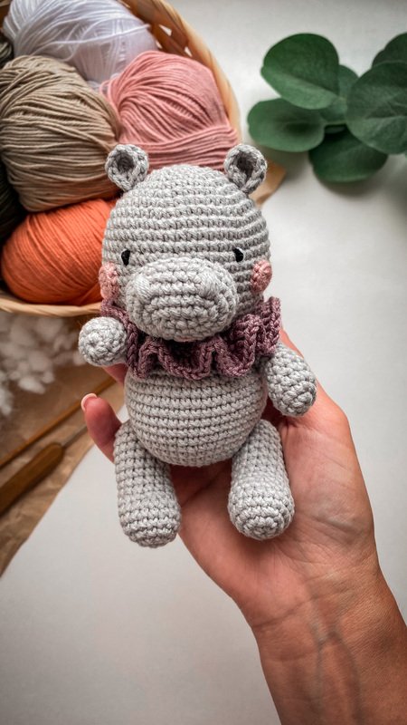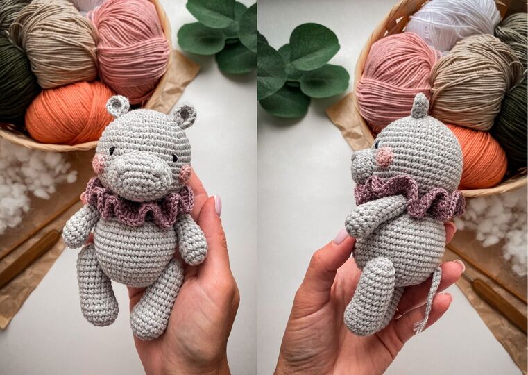 Hippo is about 5.5 inches If you use Alize Cotton Gold or Yarn Art Baby Cotton (50g/165m) or similar yarn and hook №2. The final size of the hippo depends on the yarn thickness, the hook size and the density of crocheting, so it may slightly differ from what I wrote in the pattern.