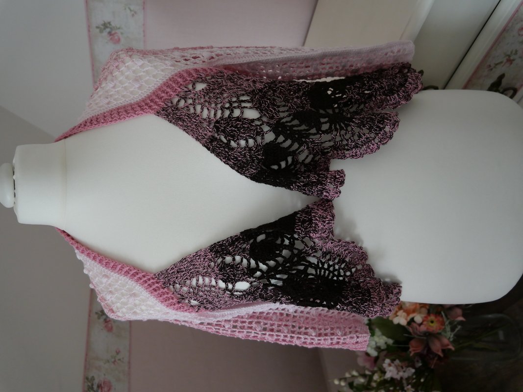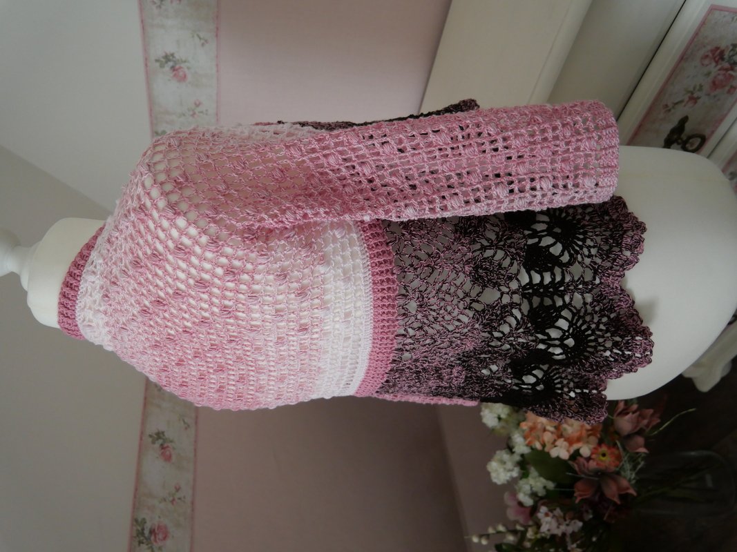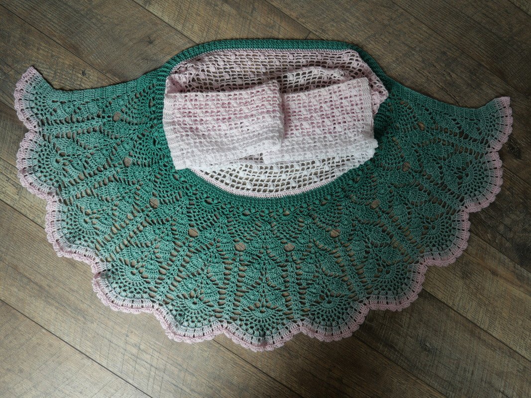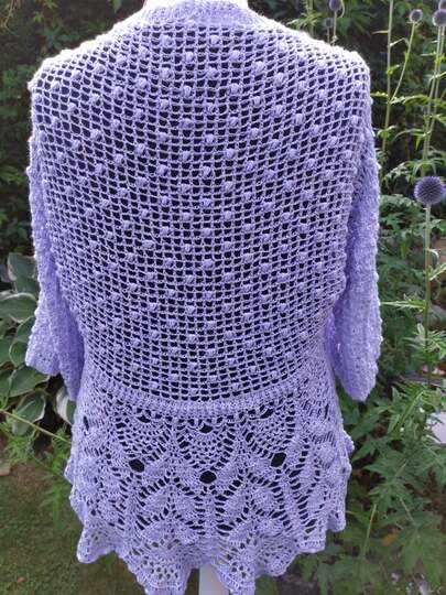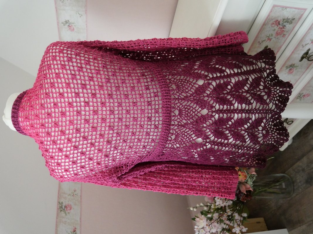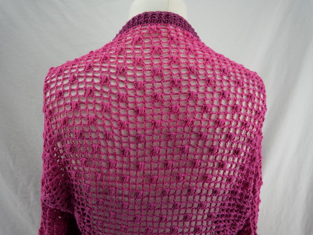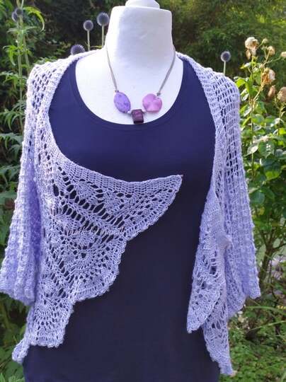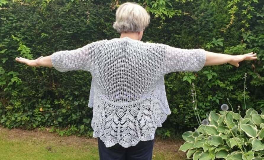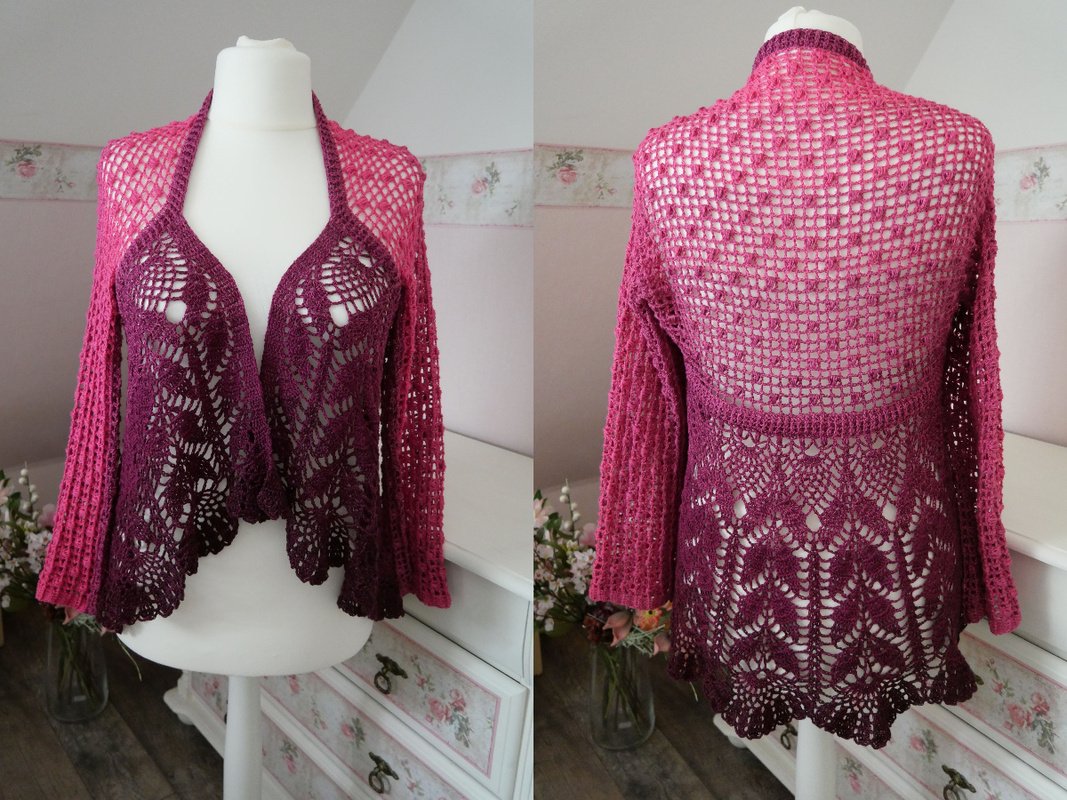 In der Anleitung enthalten sind drei Standardgrößen – 36/38, 40/42 und 44/46 und drei Längenausführungen der Spitze. Jeweils als Langarmversion. Darüber hinaus erkläre ich ausführlich, wie die Jacke an die eigenen Körpermaße angepasst werden kann. Dadurch kann ohne Probleme eine andere Garnqualität verwendet werden.