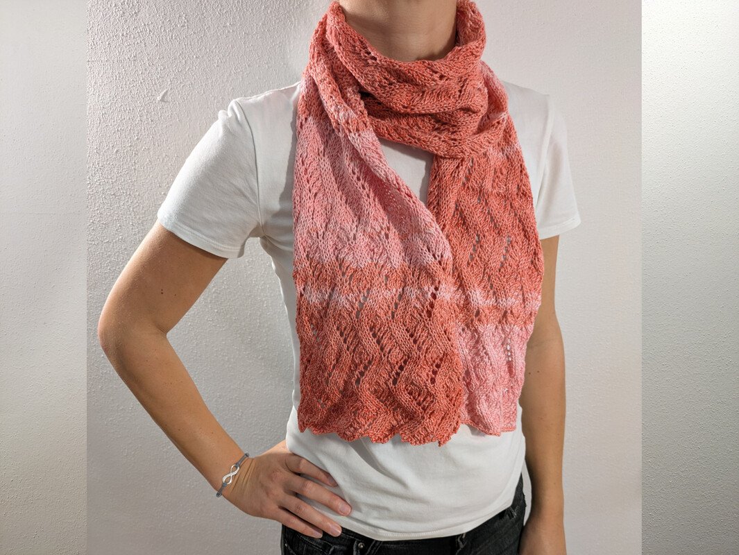 Das dünne Garn aus Baumwolle/Viskose/Acryl ist ideal für kühle Sommertage und durch den Farbverlauf rosa-rot und einem leichten Glanzeffekt auf jeden Fall ein Hingucker. Das gewellte Lochmuster wirkt aufwändig, ist jedoch einfach zu stricken, da immer wieder dieselbe Maschenfolge gestrickt wird.