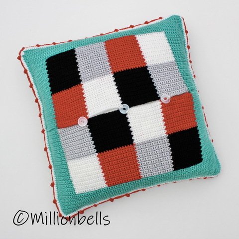 The back side of the pillow cover is worked up in an attractive checkered pattern using matching colors and has an opening with button closure across the center, to easily insert / remove the inside pillow for washing.
