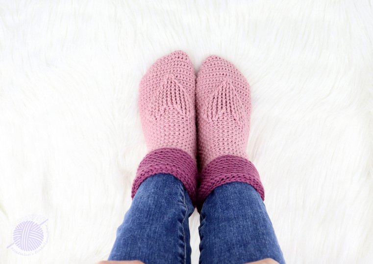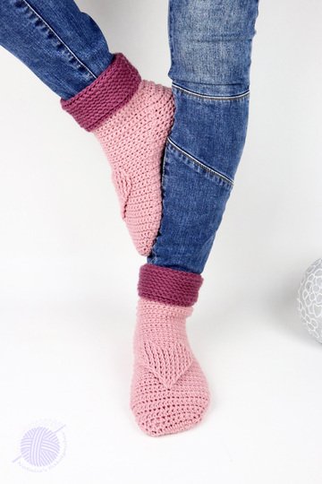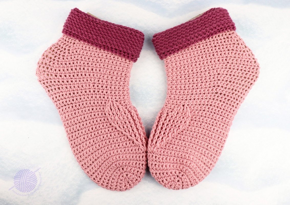 The socks are crocheted from the toe upwards and have a very comfortable heel and no disturbing seams. The socks are crocheted with sc, fpdc and half hdc. The links for the videos for crocheting in turning rounds and for decreases are attached to the pattern.