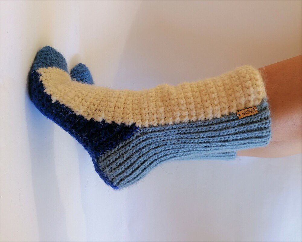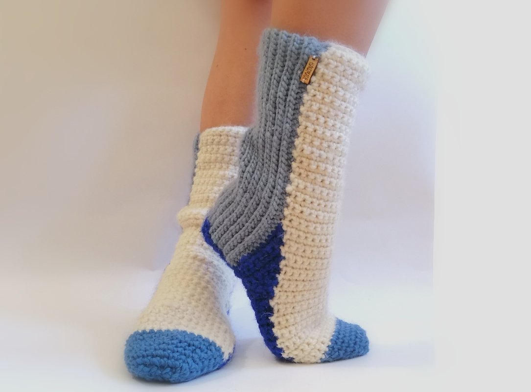 Crocheted winter, thick, home socks.