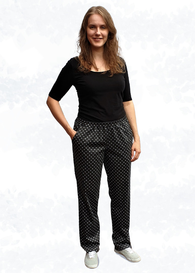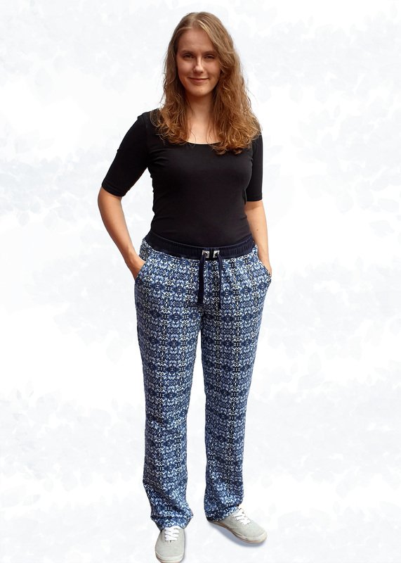 “Mira” is perfect for sewing beginners and versatile in its uses. It can be made from various knit fabrics and is great for everyday wear – for example, in jacquard jersey – or as a comfortable pair of leisure pants, such as in French terry.