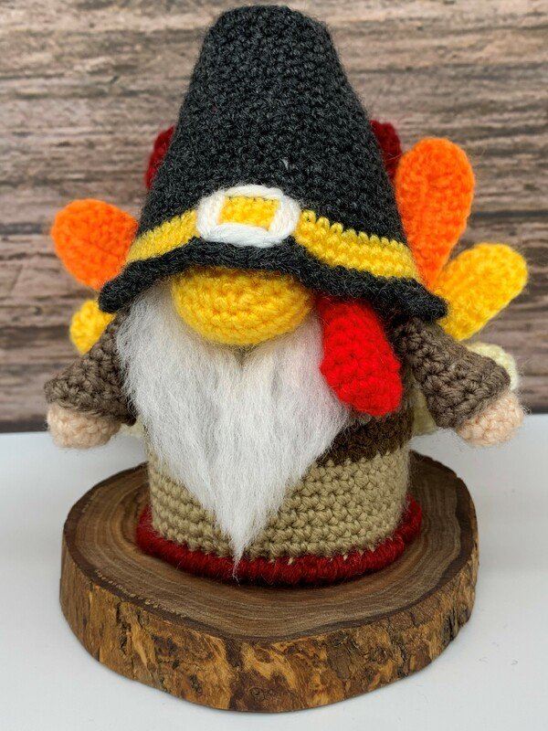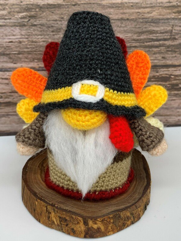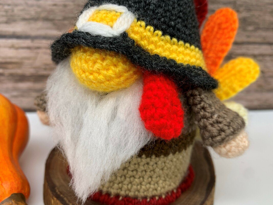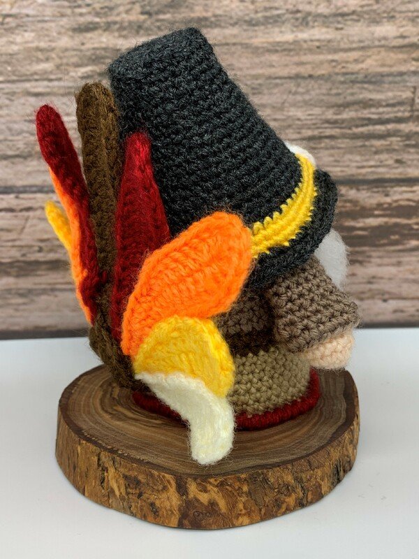 With this pattern you can crochet a cute little gnome, perfect for Thanksgiving, but he will generally be a nice decoraction in your home in the fall! He has a little pilgrim hat, and is dressed up as a turkey.
