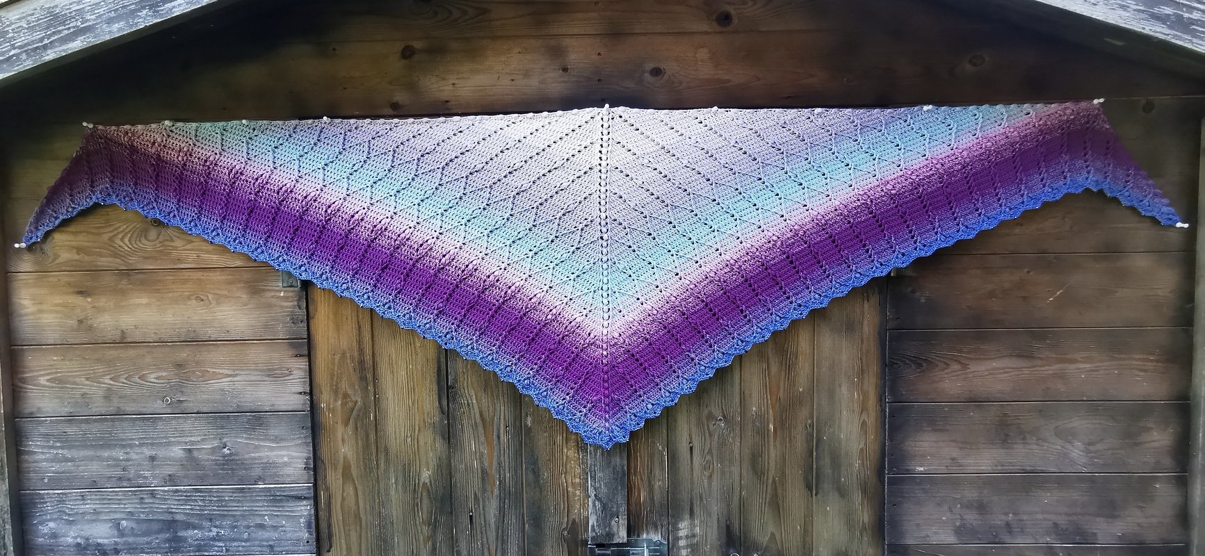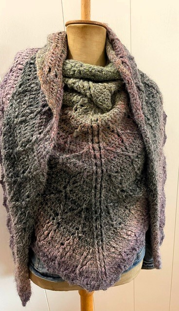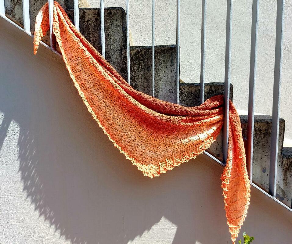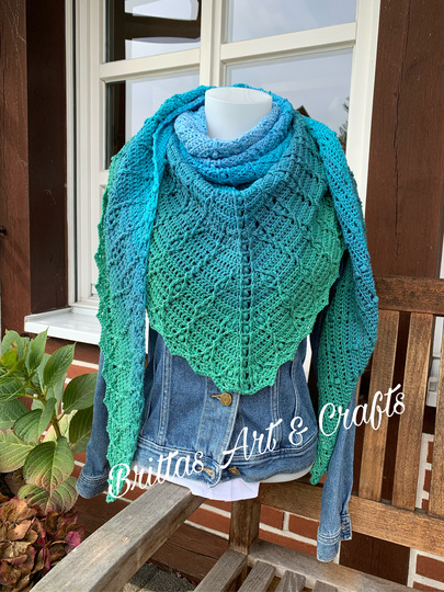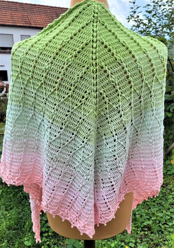 At the end of the instructions there are some sample cloths with details of the thread, the needle and the size. With medium-sized thread and a needle, the shawl will be about 200 x 70 cm. An extension is also possible.
