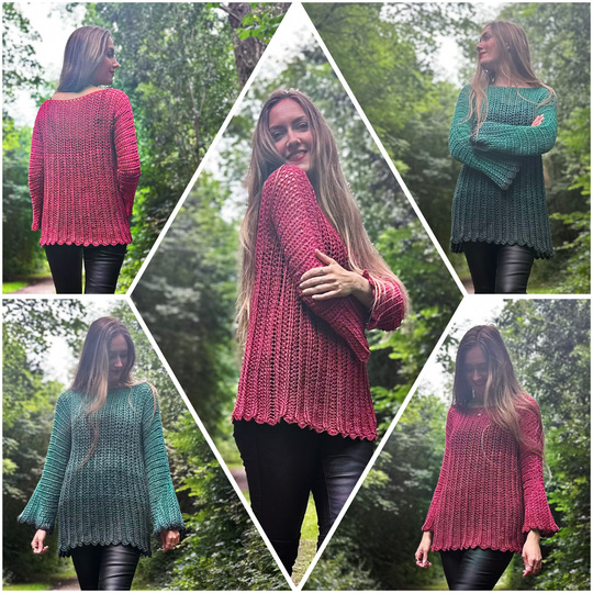 Je nach Garnauswahl, kann man den Pulli sowohl an kälteren als auch an warmen Tagen tragen. Besonders gut eignen sich hier Farbverlaufsgarne/ Bobbel, weil sie mit einem Rutsch von der Häkelnadel hüpfen.