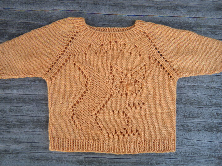 The cozy sweater is knitted in one piece with 3.5mm needles from top to bottom and fits girls and boys from freshly hatched to about 6 years.