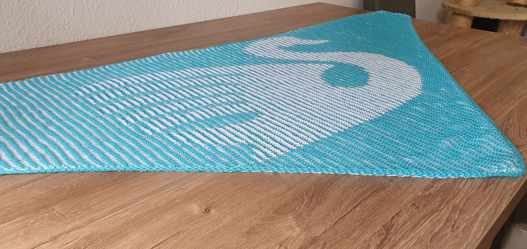 The finished shawl measures approximately 175 cm (width) x 78 cm (depth) in my version.
