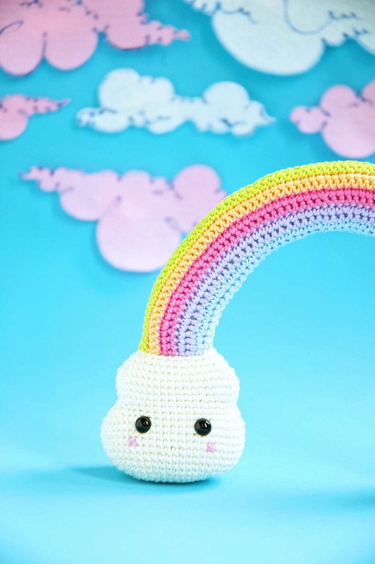 The clouds are crocheted in continuous spiral rounds and the rainbow is made out of two pieces, crocheted in the row. The pieces are then sewn together. The turning chains don't count as a stitch. Use the yarn and matching crochet hook of your choice. The result will be bigger or smaller, keeping the same proportions.