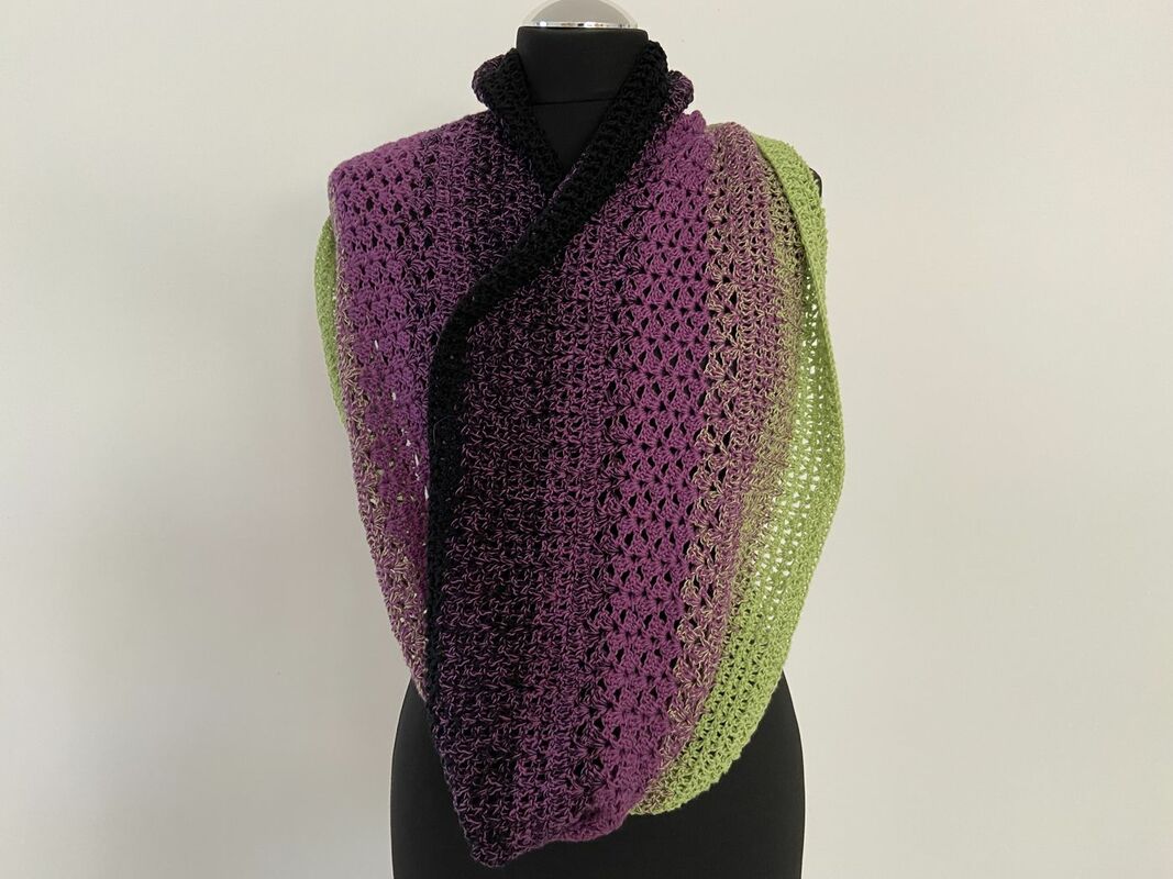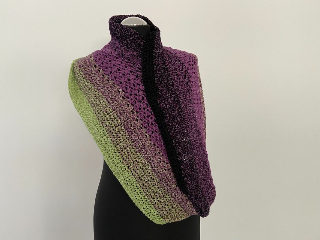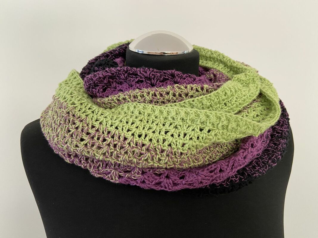 Unter Verwendung des angegebenen Materials hat der Loop einen Umfang von ca. 120 cm und kann somit zweimal um den Hals gelegt werden.
