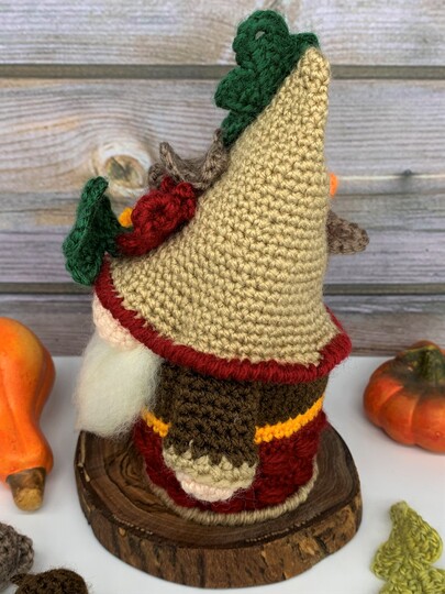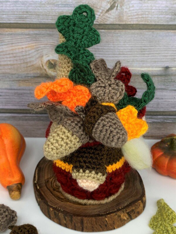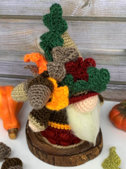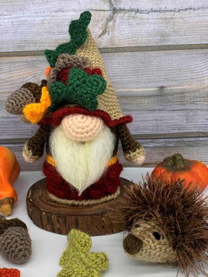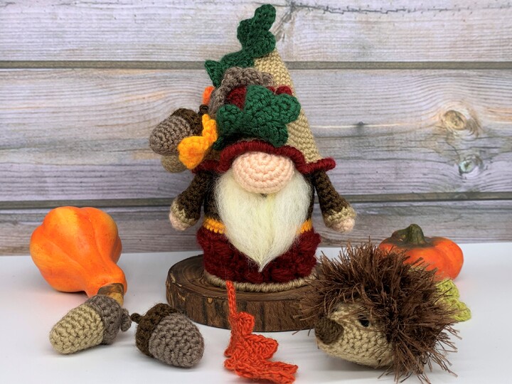 With this pattern you can crochet an adorable autumn gnome in fall colors, with oak leaves and acorns on his hat. And as a bonus, he is accompanied by a cute little hedgehog.