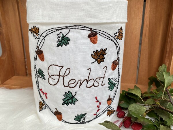 Stickdatei zum Herbst mit Laub, Eicheln, Beeren und dem Schriftzug "Herbst", enthalten in 3erlei Größen.