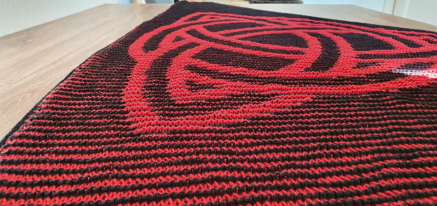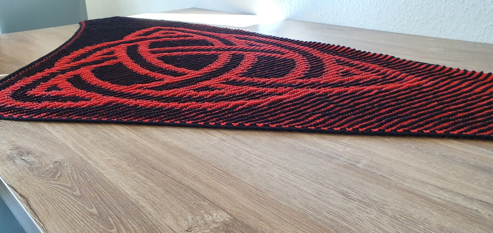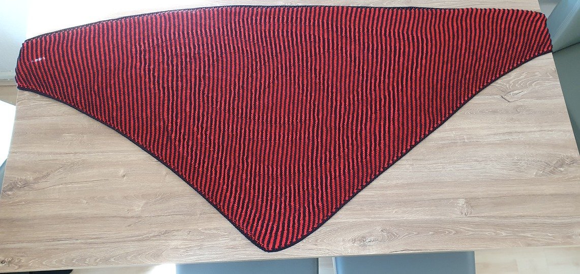 The finished shawl measures approximately 175 cm (width) x 78 cm (depth) in my version.