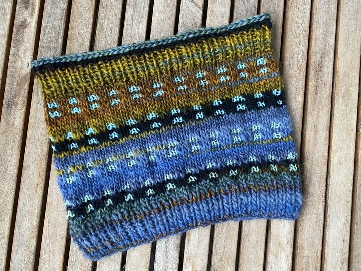 The Golden Nights Cowl is a squishy piece with a simple slip stitch pattern. It is much easier to work than colourwork. Only one colour is used per round, so this is a very relaxing and enjoyable knit.