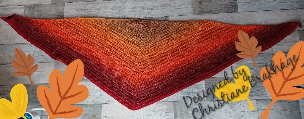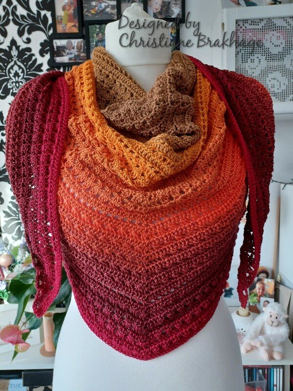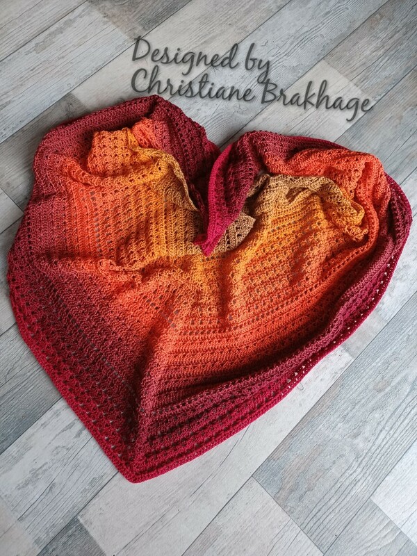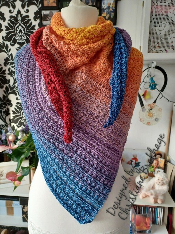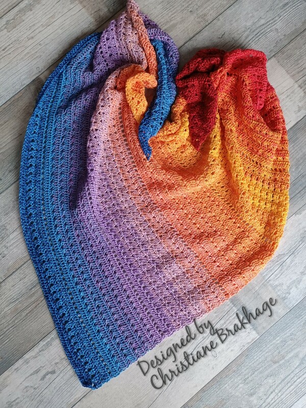 Das flache Dreiecktuch aus 1200m/4-fädigem Farbverlaufsgarn hat eine Größe von 2,25 m/0,61 m.