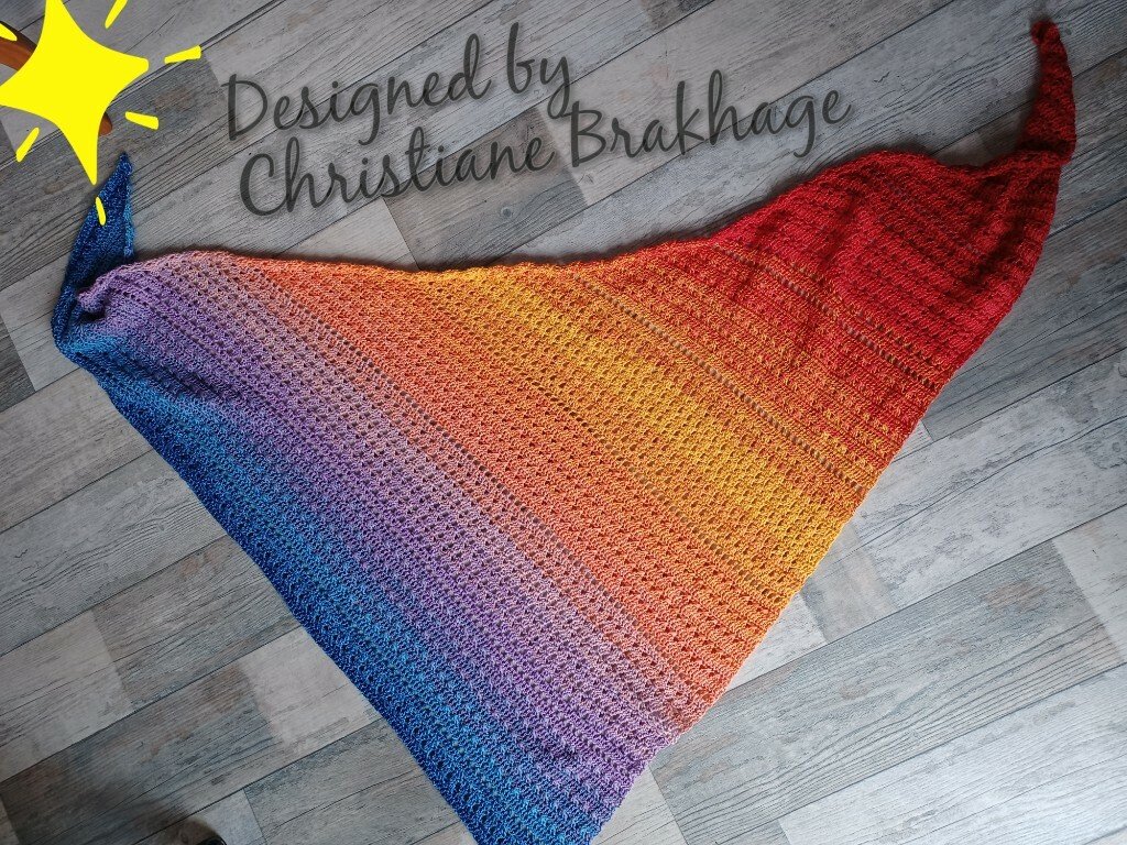 Das asymmetrische Tuch aus 1000m/4fädigem Frabverlaufsgarn hat eine Größe von 1,85 m/0,80 m