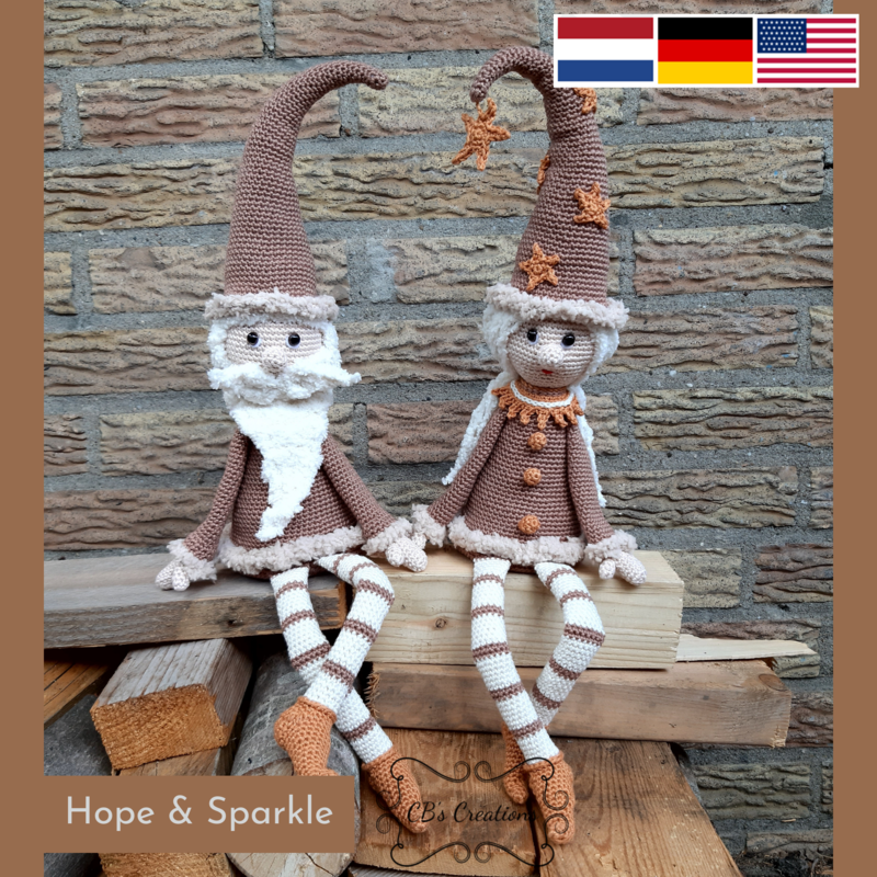 This PDF consists of 18 pages with instructions and pictures to show you how you can crochet Hope & Sparkle yourself. The Crochet pattern uses US stitches and abbreviations. They will be 33cm tall.