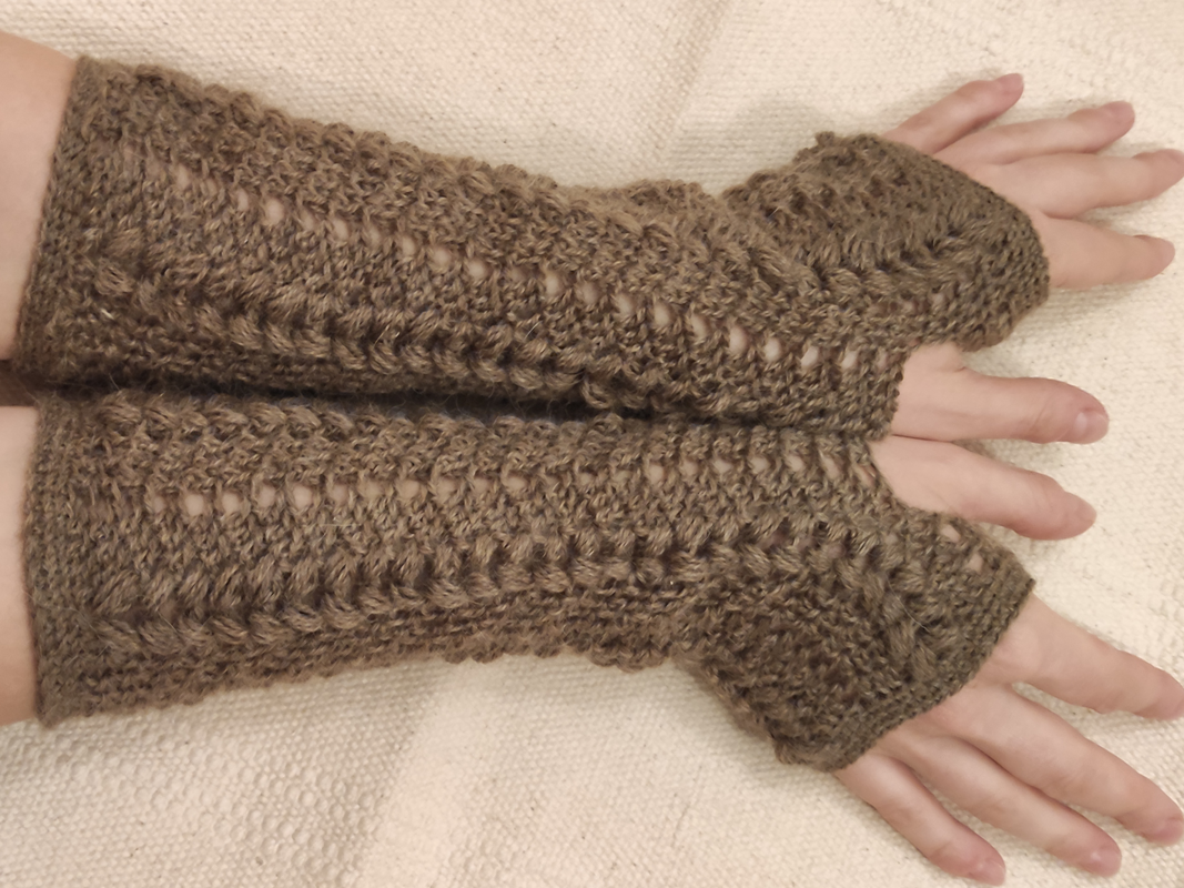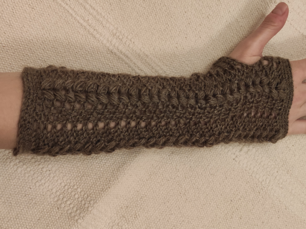 Vor diesem Hintergrund sind die Armstulpen "Romantischer Herbst" entstanden, welche besonders mit leichten, natürlichen Garnen zur Geltung kommen. Das verspielte Muster geht nach wenigen Runden leicht von der Hand und zeichnet sich durch einen Wechsel von luftigen Passagen und hervorgewölbten weichen Noppen aus.
