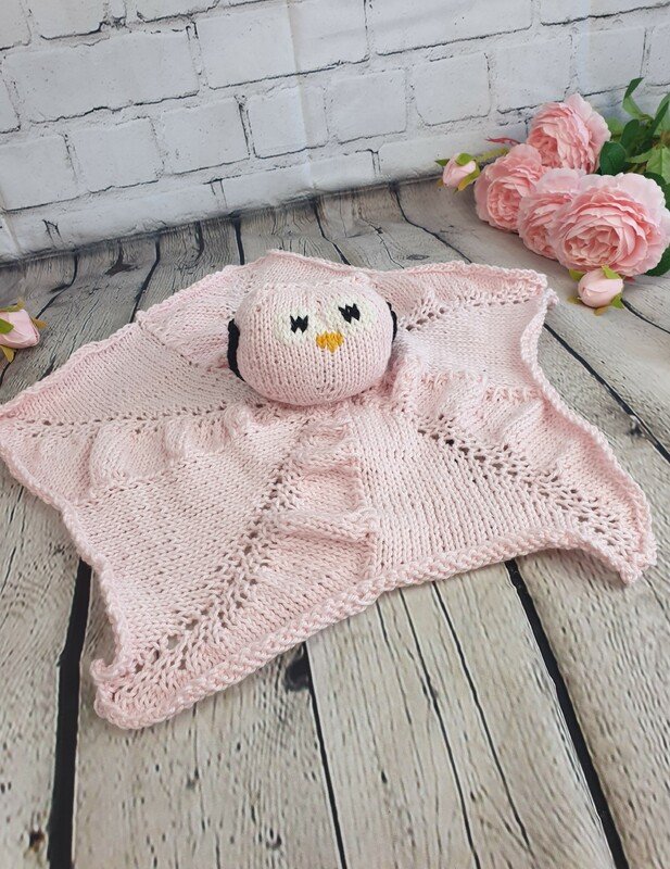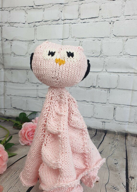 This is a Knitting Pattern for a super cute Owl Lovey / Comforter. The Base is worked in rounds from the inside out with increasing and decreasing in each second round which gives a very unique look almost like a shell. The Face is worked with Swiss Darning a few beginner steps for this are included in the pattern.