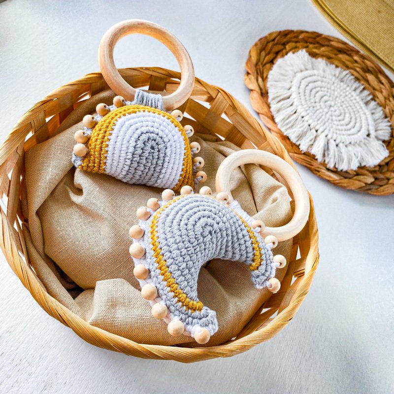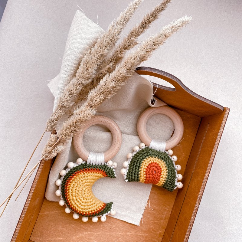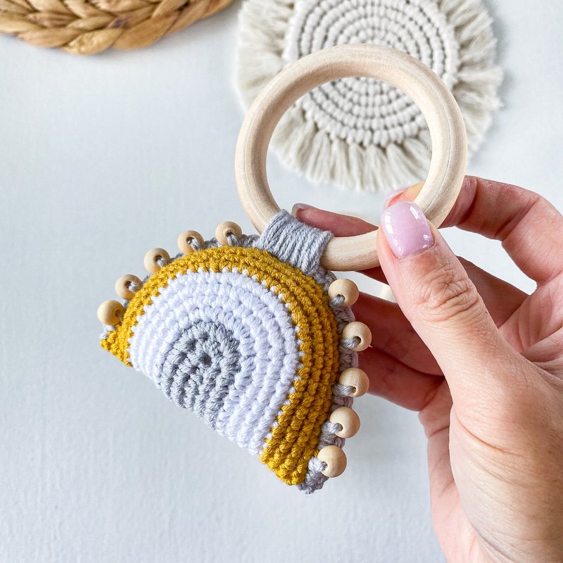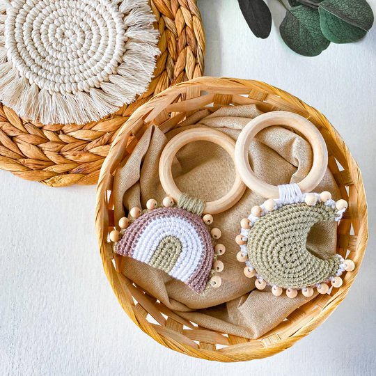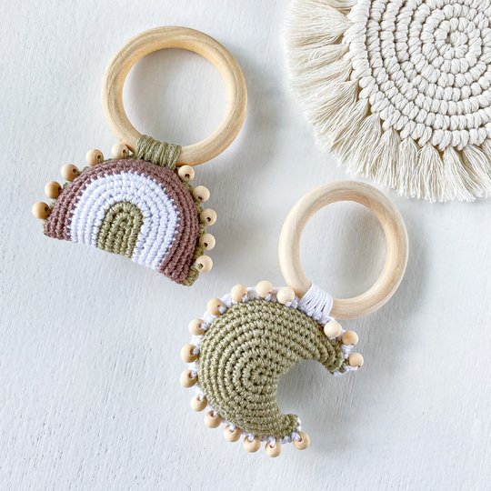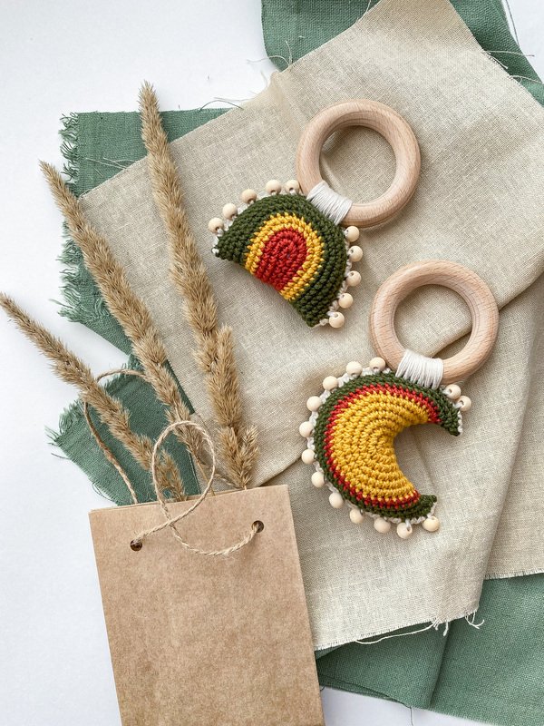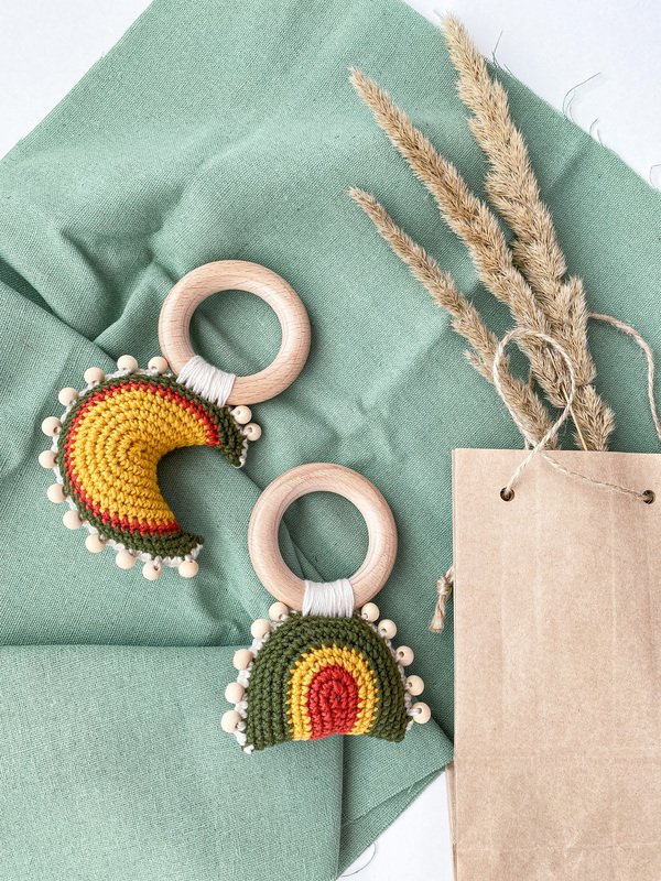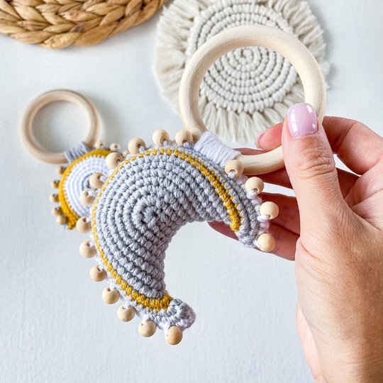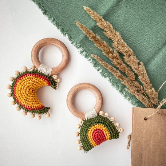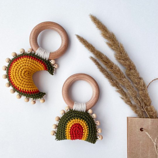 The crochet pattern is in PDF format in English. It includes detailed instructions crocheting both rattles - Rainbow and Moon.