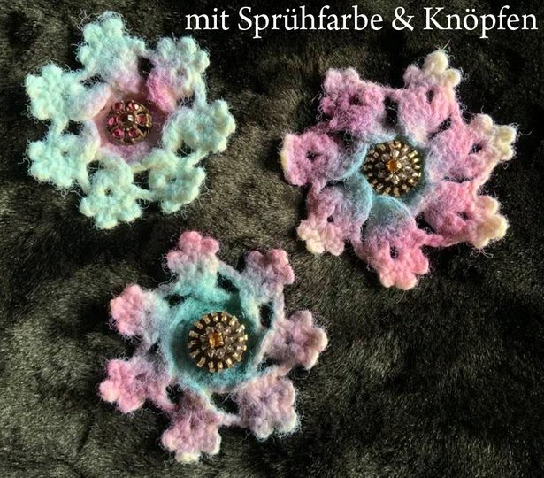 Toll ist natürlich auch noch Klebeglitter oder Sprühfarbe zu benutzen und schöne Glitzerknöpfe in die Mitte zu nähen...