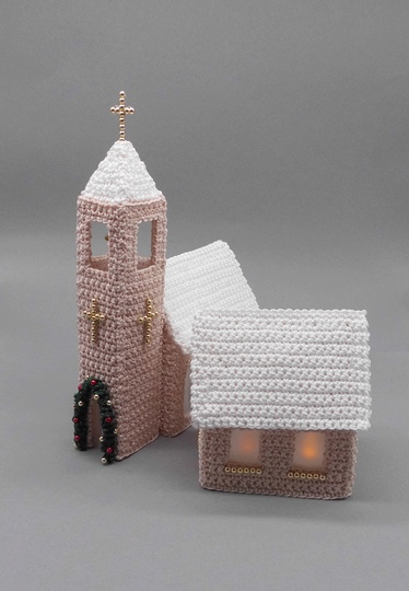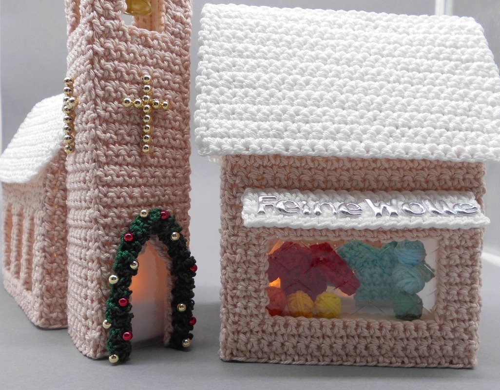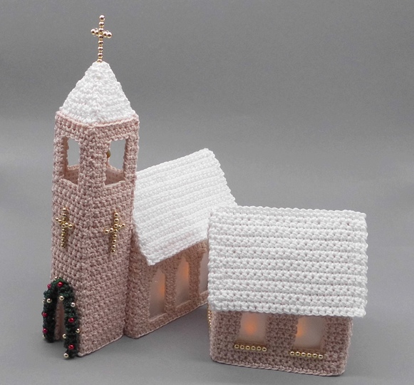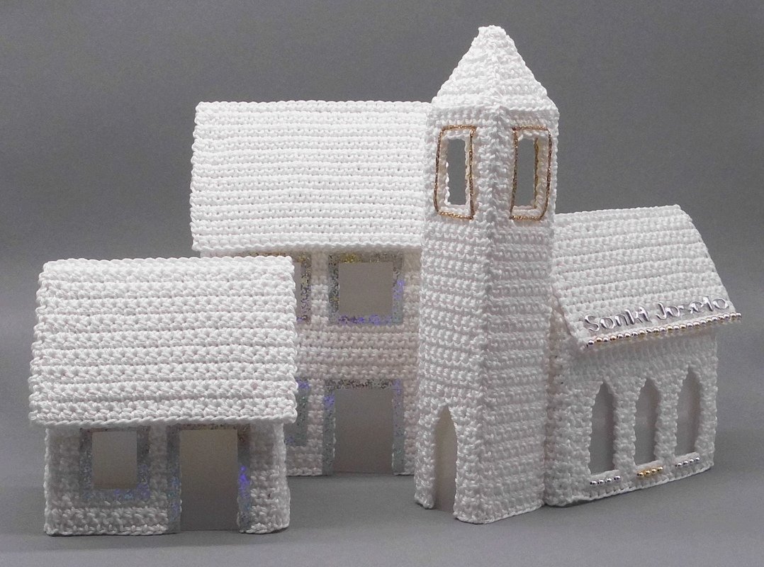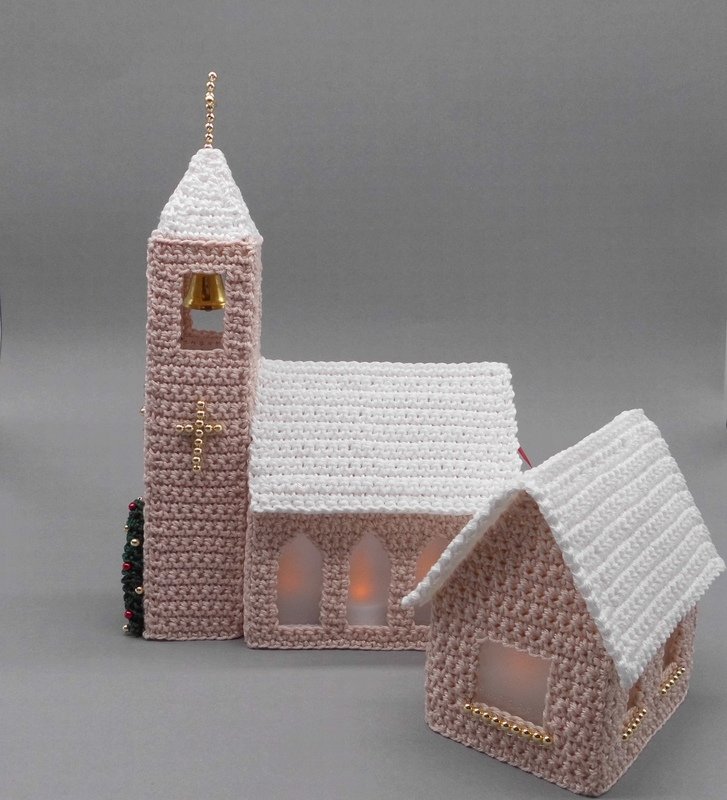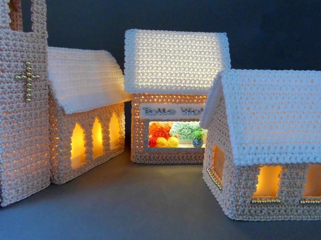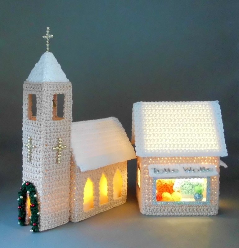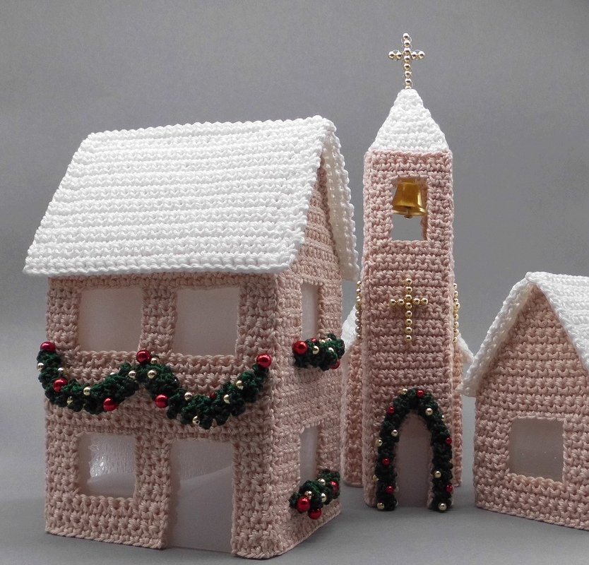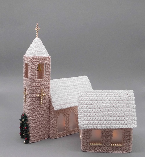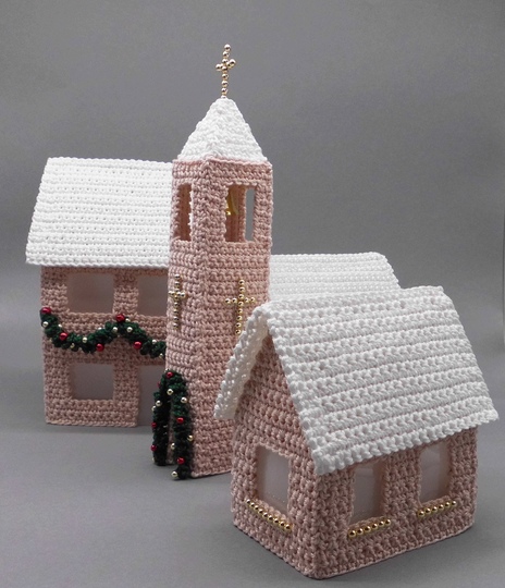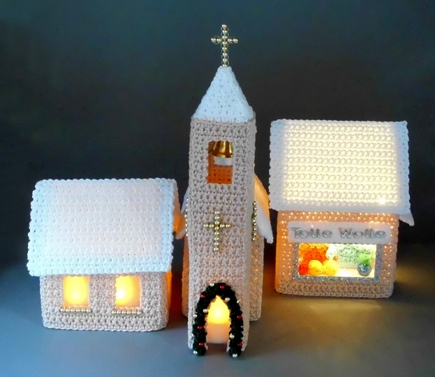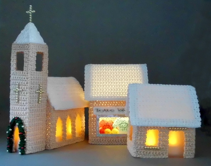 This PDF tutorial contains the crochet charts and counting patterns for the two small houses and the big one, for the store with nice decoration and of course for the church.