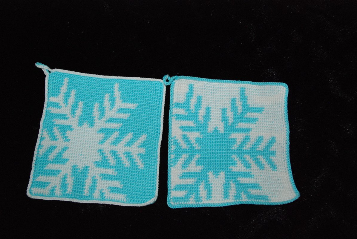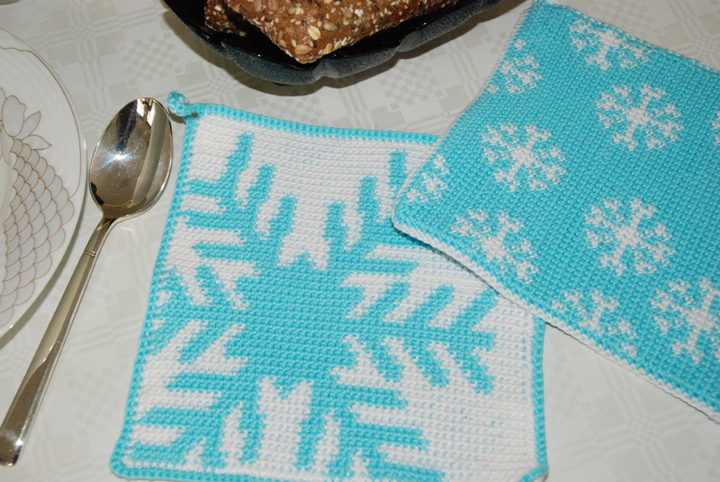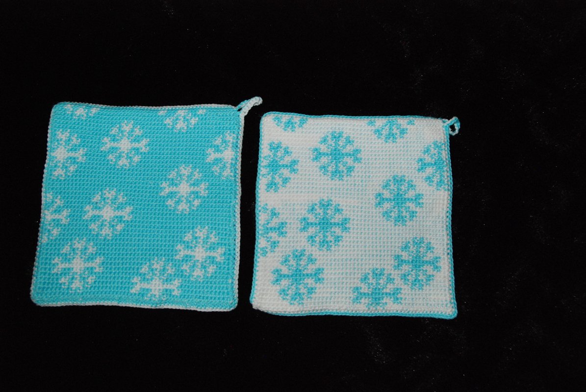 The designs on these potholders are several small snowflakes and one large (not quite visible) snowflake.