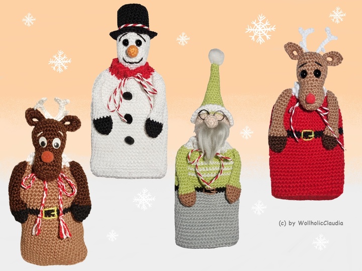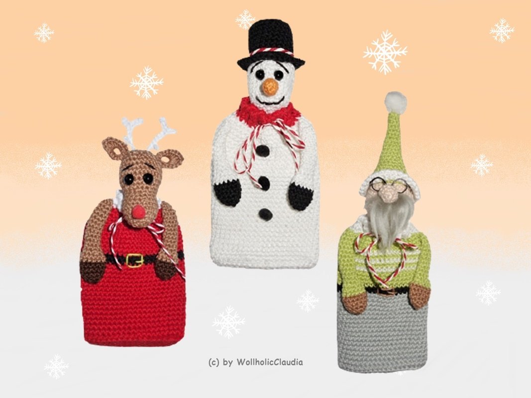 Hier erhälst du die Anleitung für 3 zauberhafte Geschenkesäckchen. Einmal Rentier, Schneemann und Wichtel.