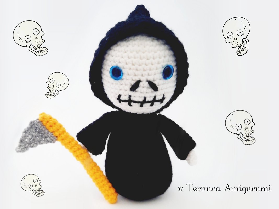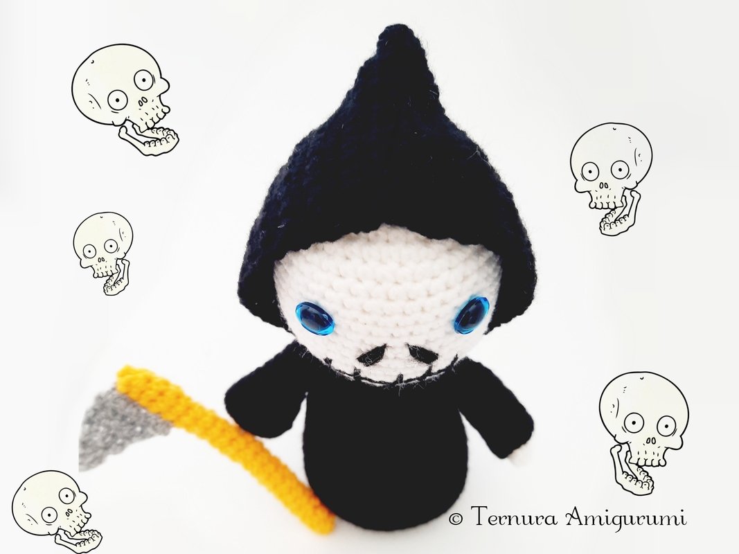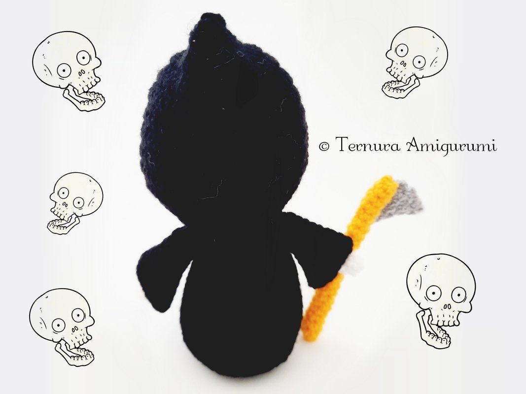 Here I bring you a nice Grim Reaper! It is very nice, you can make it for Halloween or to add to your collection, the children love it! His finished measurements are approximately 20cm. The size may vary depending on the size of the needle and the yarn.