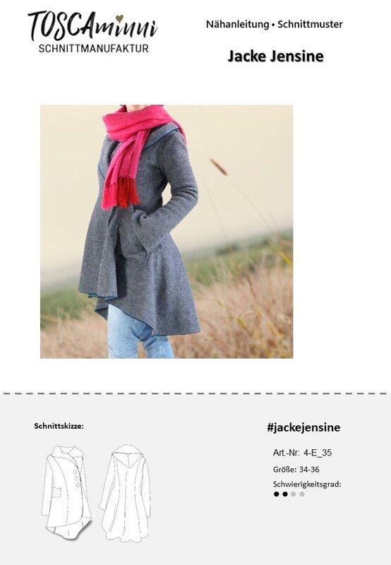 With the Jensine pattern you can make an extravagant women's jacket. The jacket has a fitted and asymmetrical cut. You can choose between straight or flared sleeves. The pattern also includes eye-catching patch pockets or side pockets.