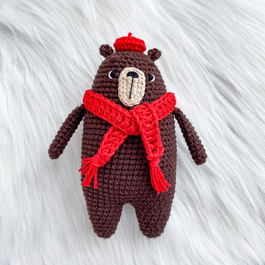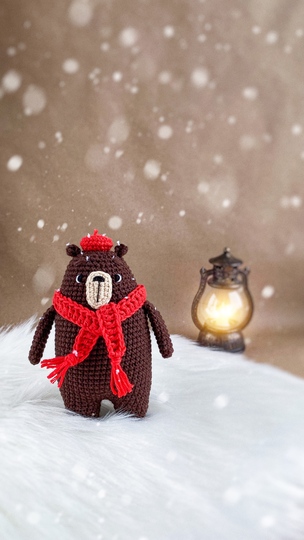 Bear is about 6 inches If you use Alize Cotton Gold or Yarn Art Baby Cotton (50g/165m) or similar yarn and hook №2. The final size depends on the thickness of the yarn, the size of the hook and the density of crocheting, so it may slightly differ from what I wrote in the pattern.