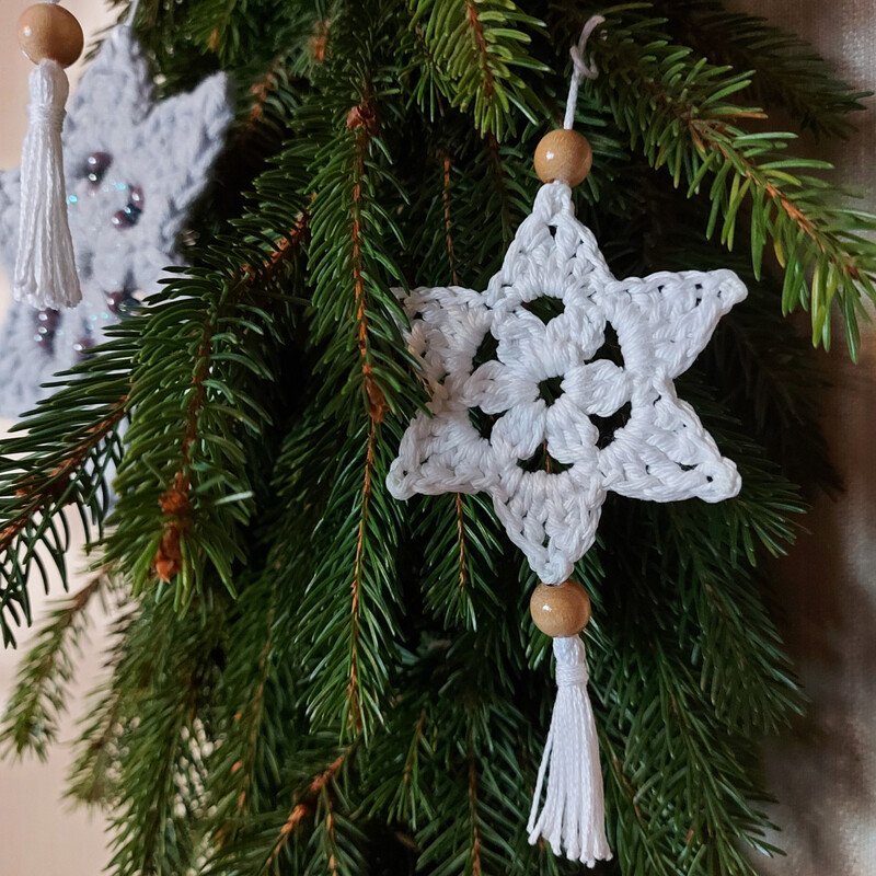 Depending on the yarn you use, the size will be different. Use a cotton yarn (yarn weight Sport - 5ply | Fine (2)) and the star will measure about 7cm. Or use a bulky wool (yarn weight Bulky - 12ply | Bulky (5)) and the star will be about 12cm in diameter.