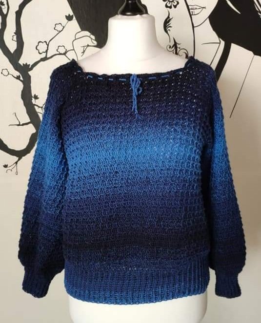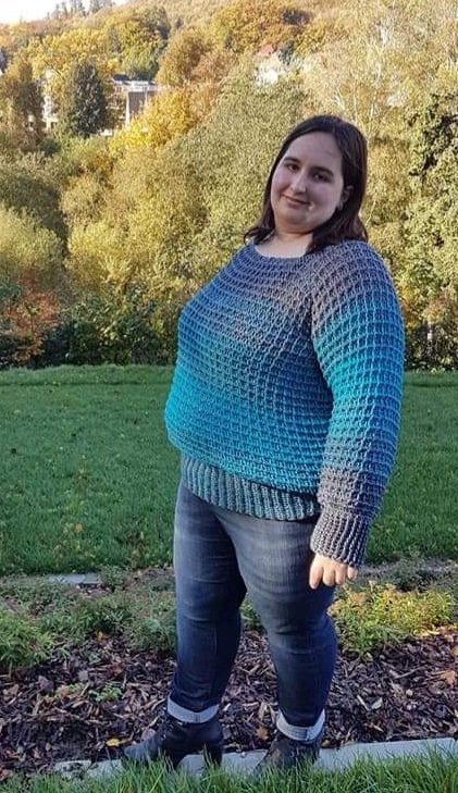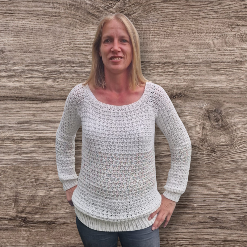 Der Pullover kann in jeder Kleidergröße gehäkelt werden.