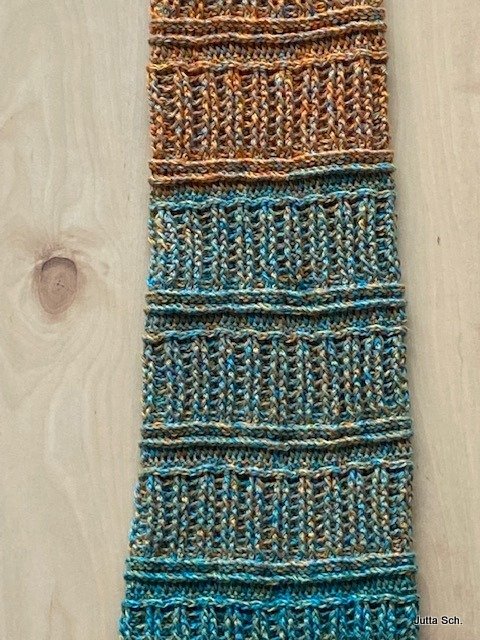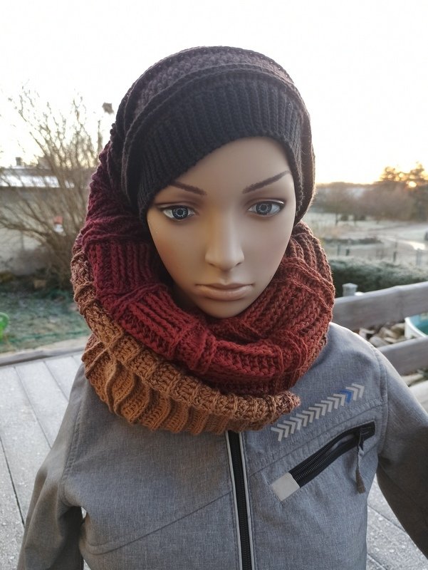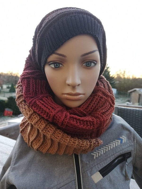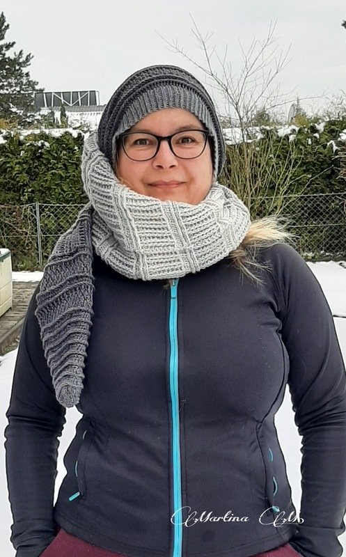 So here is Zipfelbert. Zipfelbert consists - as requested - of many post relief stitches. It keeps your head and ears warm and at the same time it is a cozy scarf.