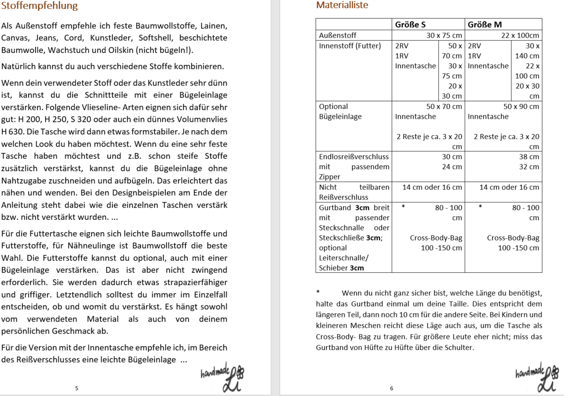 Das E-Book beinhaltet zwei Schnittmuster: Größe S 34cm breit x 15 cm hoch x 10cm tief und Größe M 40 cm breit x 18 cm hoch x 10cm tief. Mit 2 Reißverschlüssen Sie kann in 2 Größen genäht werden, wahlweise auch nur mit einem Reißverschluss oder Innentasche. Die Tasche ist gefüttert.