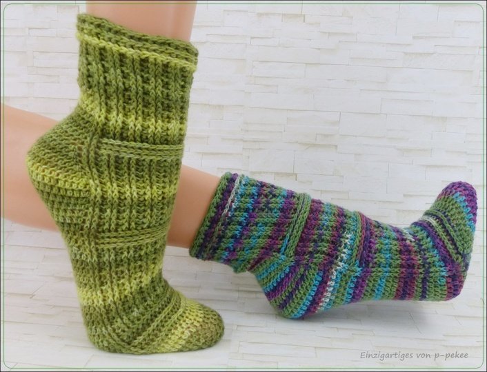 Easy-Soks°16 die gehäkelte Wohlfühlsocke (4-fach-Sockenwolle) ohne komplizierte Ferse - dafür mit einem schönen Muster.