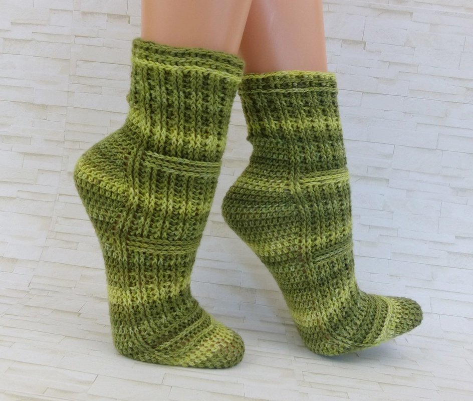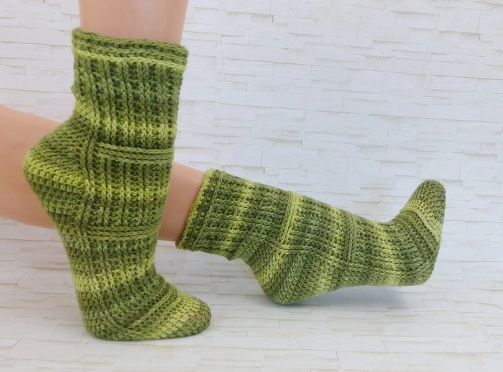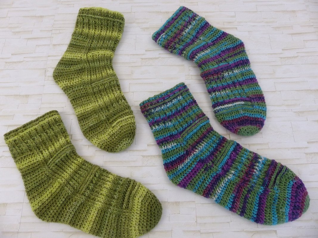 Häkelsocken sind im Allgemeinen dicker als gestrickte Socken. Die Reliefstäbchen tragen zusätzlich etwas auf und somit entsteht eine gemütliche Socke für warme Füße.